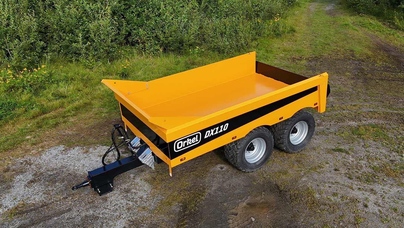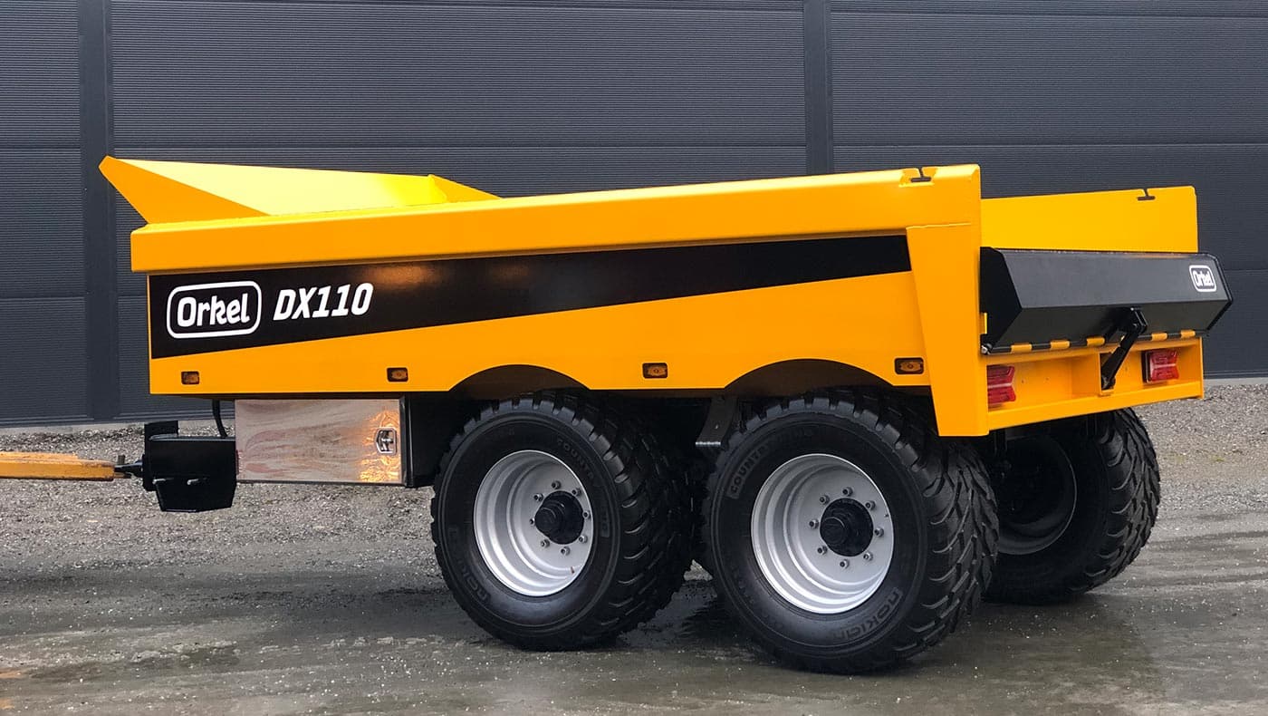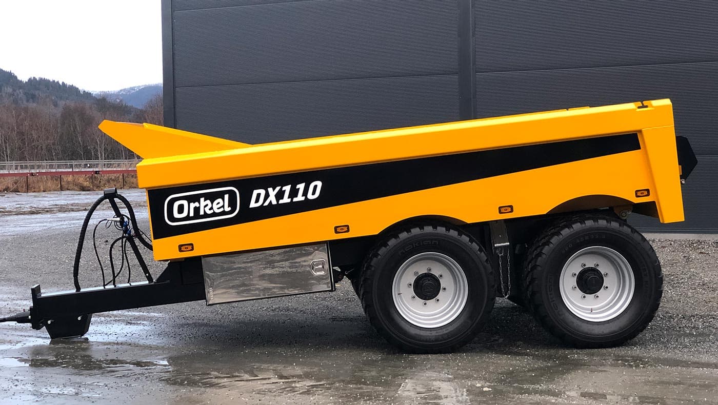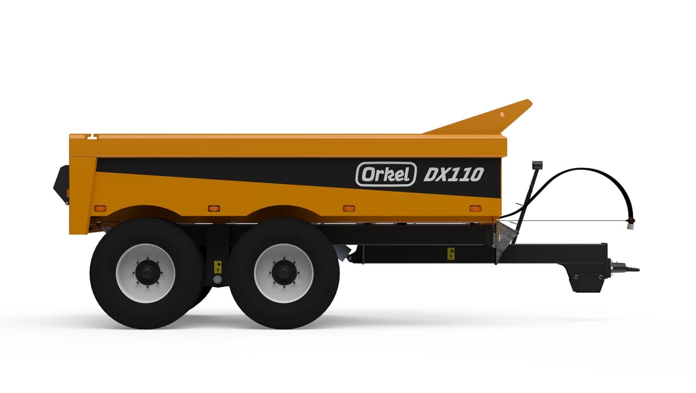 Orkel DX110 er utviklet og konstruert for de tyngste transportoppgavene. Hengeren har kraftig H-ramme med solide boggikasser med forsterkede 8 bolters nav og utvendige bremsesylyndre. Hengeren leveres med hydraulisk bakluke og skvettkarm som standard. Dumperen DX110 vil med sin anvendelighet og solide konstruksjon være et naturlig valg for deg som driver anleggsvirksomhet. DX110 er bygget i 8mm Hardox 450 i bunn og 6mm Hardox 450 i sider, med en karmhøyde på 64cm. Tillatt totalvekt er 15 300 kg.