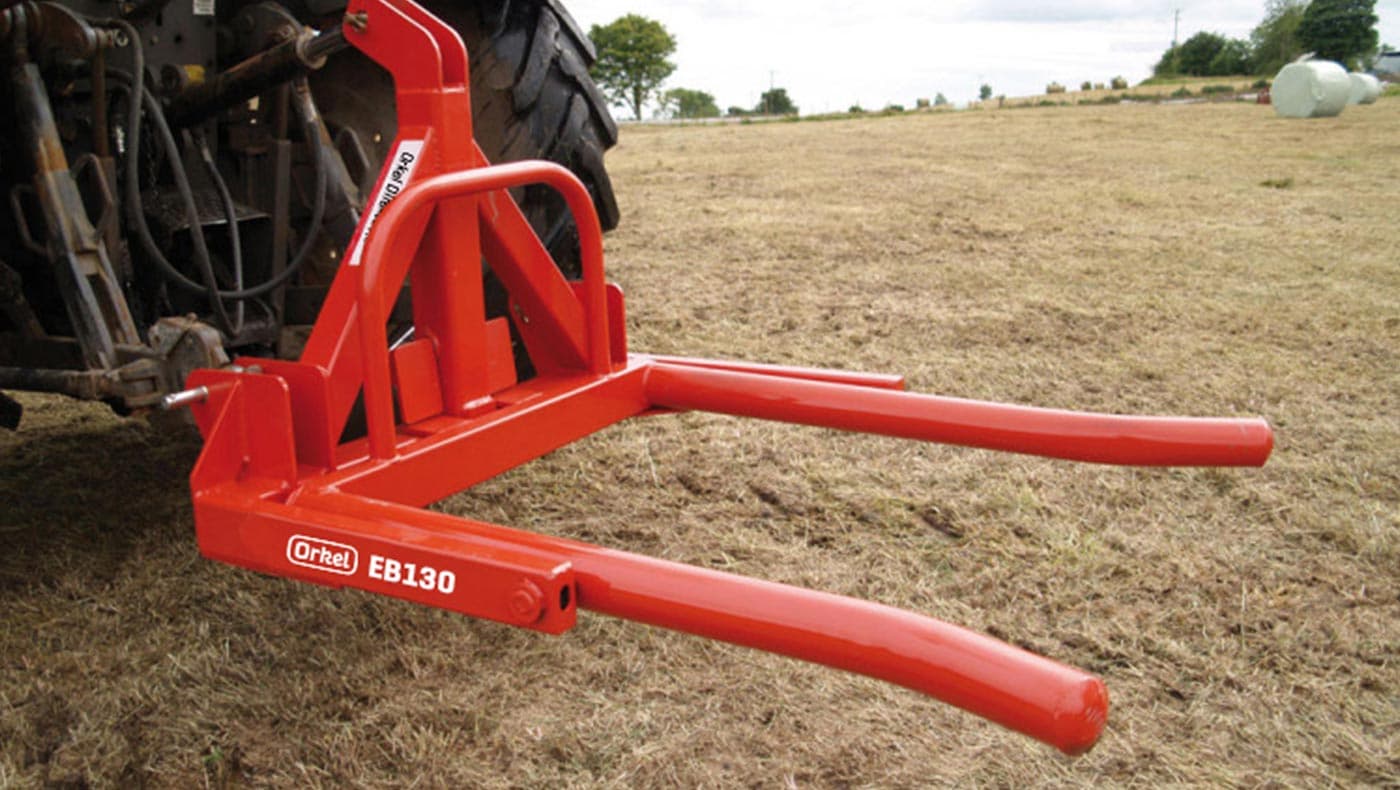 Orkel EB 130 har mekanisk tipplås og er enkel å manøvrere. det er enkel ballegaffel for rundball med diameter inntil 130 cm.