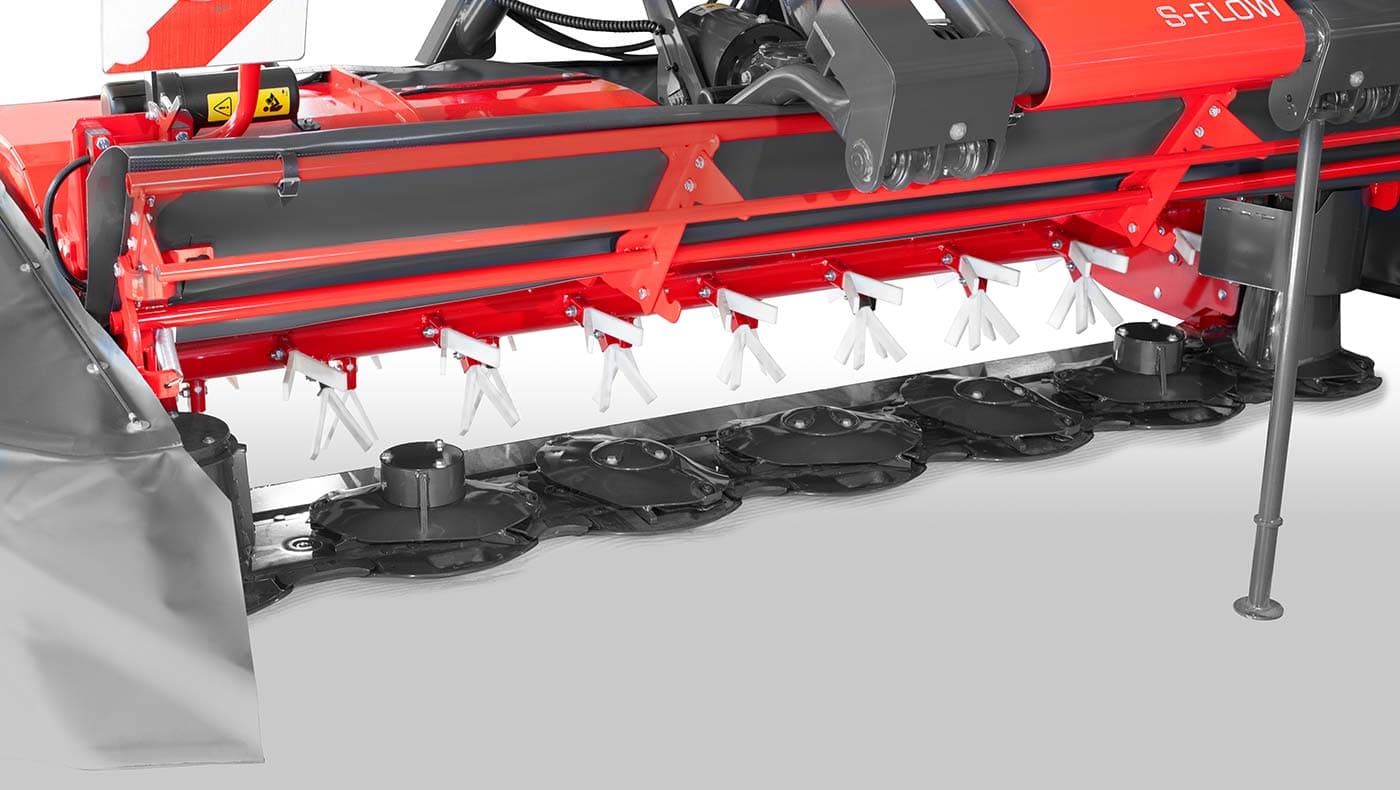 For å oppnå et effektivt og godt slåtteresultat er optimal flyt viktig der det er avgjørende å få flyttet slått gras til baksiden av bjelken så fort som mulig slik at gras-strømmen ikke bremses. Dette er grunnen til at vi har utviklet spesialutformede slåtteskiver som gir en kjapp og effektiv forflytning av graset over bjelken, også i bratt lende.
