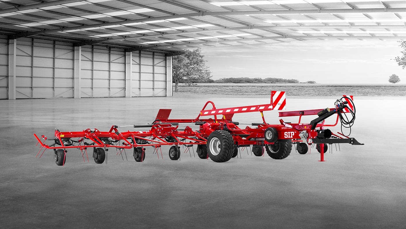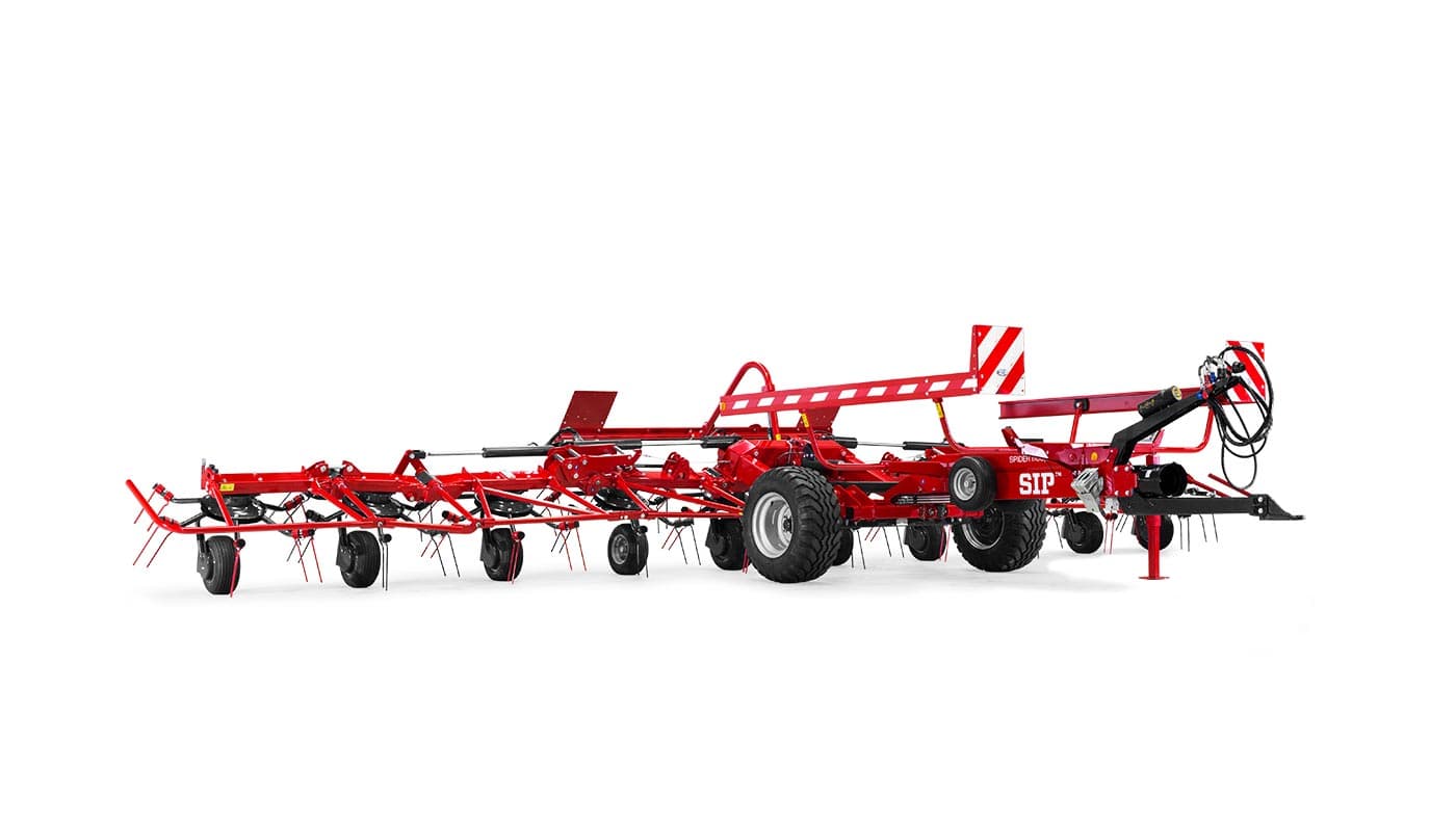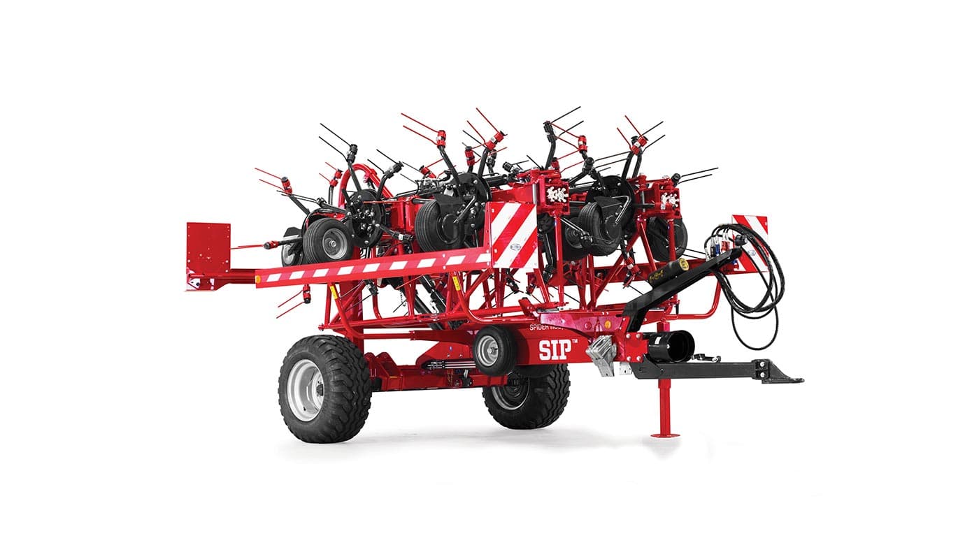 SIP SPIDER 1100/10-T er en slept 10-rotors sprederive som er ekstremt robust og kompakt, samtidig som den forblir lett. Til tross for den store arbeidsbredden gir de sammenkoblede beskyttelsesskinnene utmerket stabilitet. Hver rotor tilpasser seg terrenget individuelt, og den mindre diameteren med patentert rotorvinkeljustering sikrer jevn spredning uavhengig av fôrmengde.