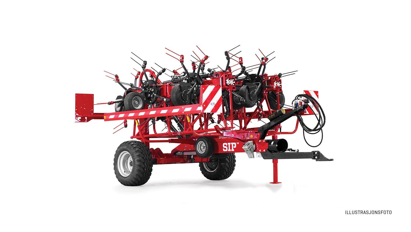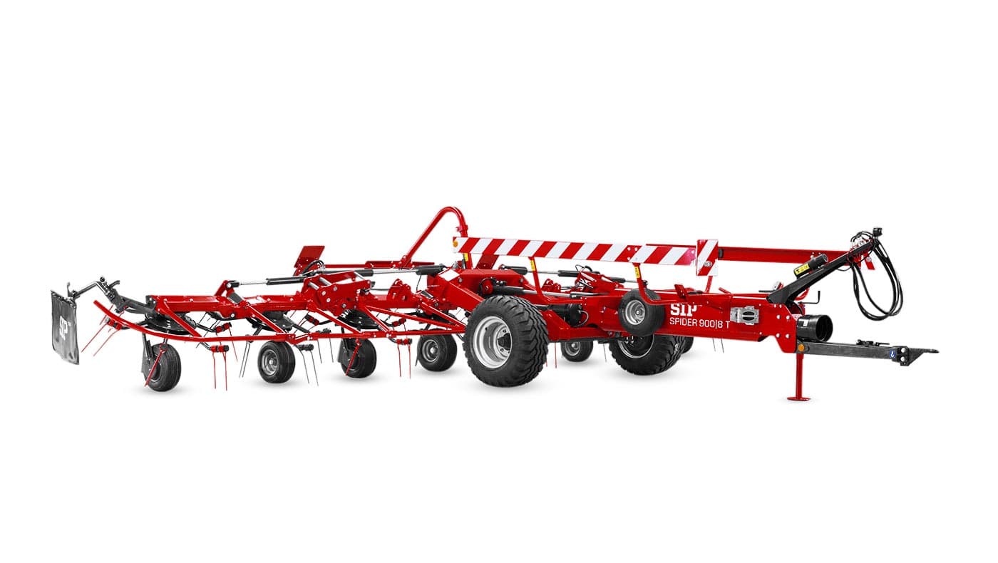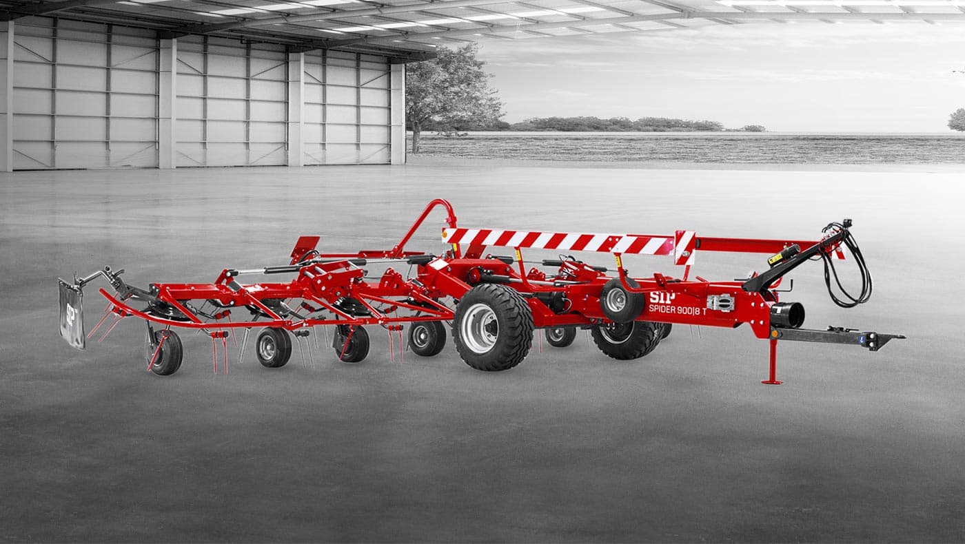 SIP SPIDER 900/8-T er en slept 8-rotors sprederive som er ekstremt robust og kompakt, samtidig som den forblir lett. Til tross for den store arbeidsbredden gir de sammenkoblede beskyttelsesskinnene utmerket stabilitet. Hver rotor tilpasser seg terrenget individuelt, og den mindre diameteren med patentert rotorvinkeljustering sikrer jevn spredning uavhengig av fôrmengde.